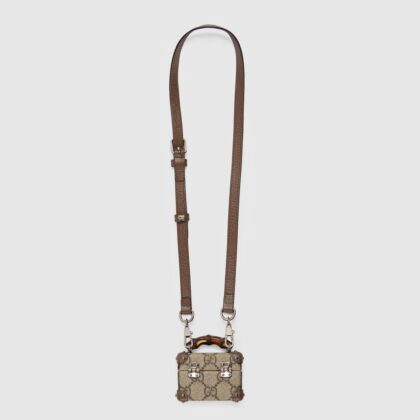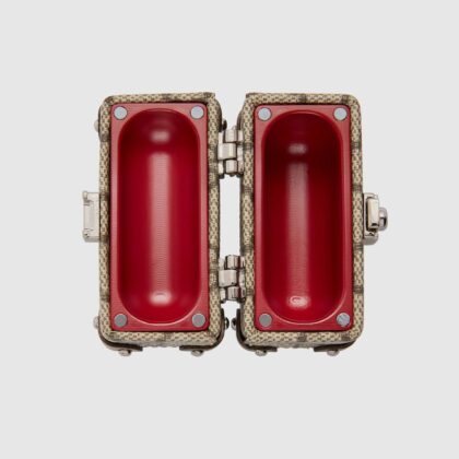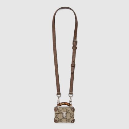 Как следует из названия, этот аксессуар предназначен для AirPods Pro. Он изготовлен из канвы GG Supreme бежевого и черного цвета, кожи и металла. В кейсе также есть искусственный замок и ключ, вдохновленный маркой Padlock, и ручка в стиле Bamboo Line. Наконец, внутренняя часть корпуса красного цвета с магнитной застежкой.
