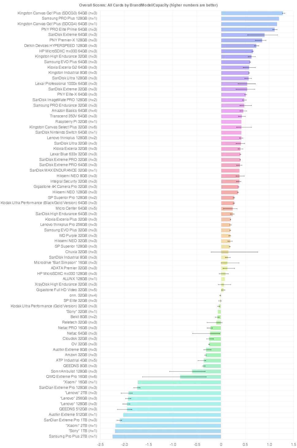 Несмотря на раздельное тестирование по критериям надёжности и скорости, в итоговом рейтинге доминировали одни и те же модели карт. Это позволило составить сводную десятку лучших SD-карт. SanDisk заняла третье место — вопреки ожиданиям, а Lexar, ранее рекомендованная как надёжное решение для карт высокой ёмкости, выпала из топ-10. Этот результат стал для исследователя неожиданным.